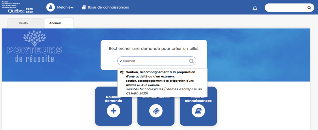 Dans la page d’accueil de l’application, utiliser la barre de recherche et inscrire le mot examen.