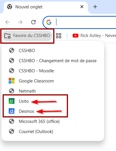 1. Un redémarrage de l’appareil est recommandé. 2. L’élève s’identifie à son appareil comme d’habitude. 3. L’élève retrouve l’outil nécessaire dans ses favoris du CSSHBO (voir image ci-dessous)