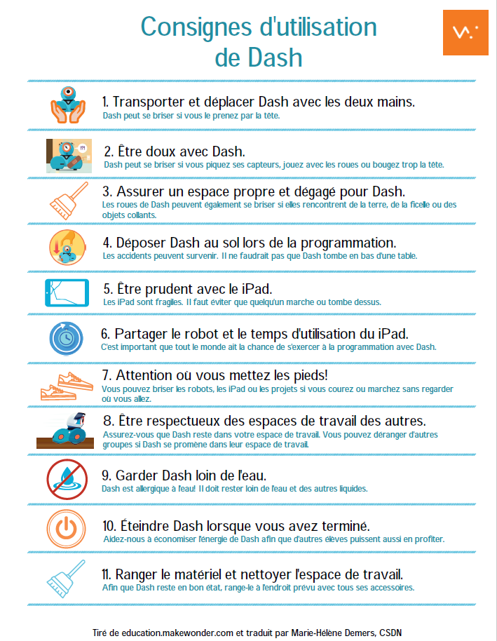 Dash est un robot très aimé des enfants. Il peut se déplacer, danser, allumer différentes lumières, parler et émettre des sons. Dash comporte de nombreux capteurs qui lui permettent de contourner différents obstacles. Il avance par déplacements de dix centimètres. Les différentes façons de programmer le robot nous permettent de varier énormément nos défis du préscolaire au secondaire. Il peut être doté de certains accessoires: catapulte, xylophone, porte-crayon, bulldozer, etc.
